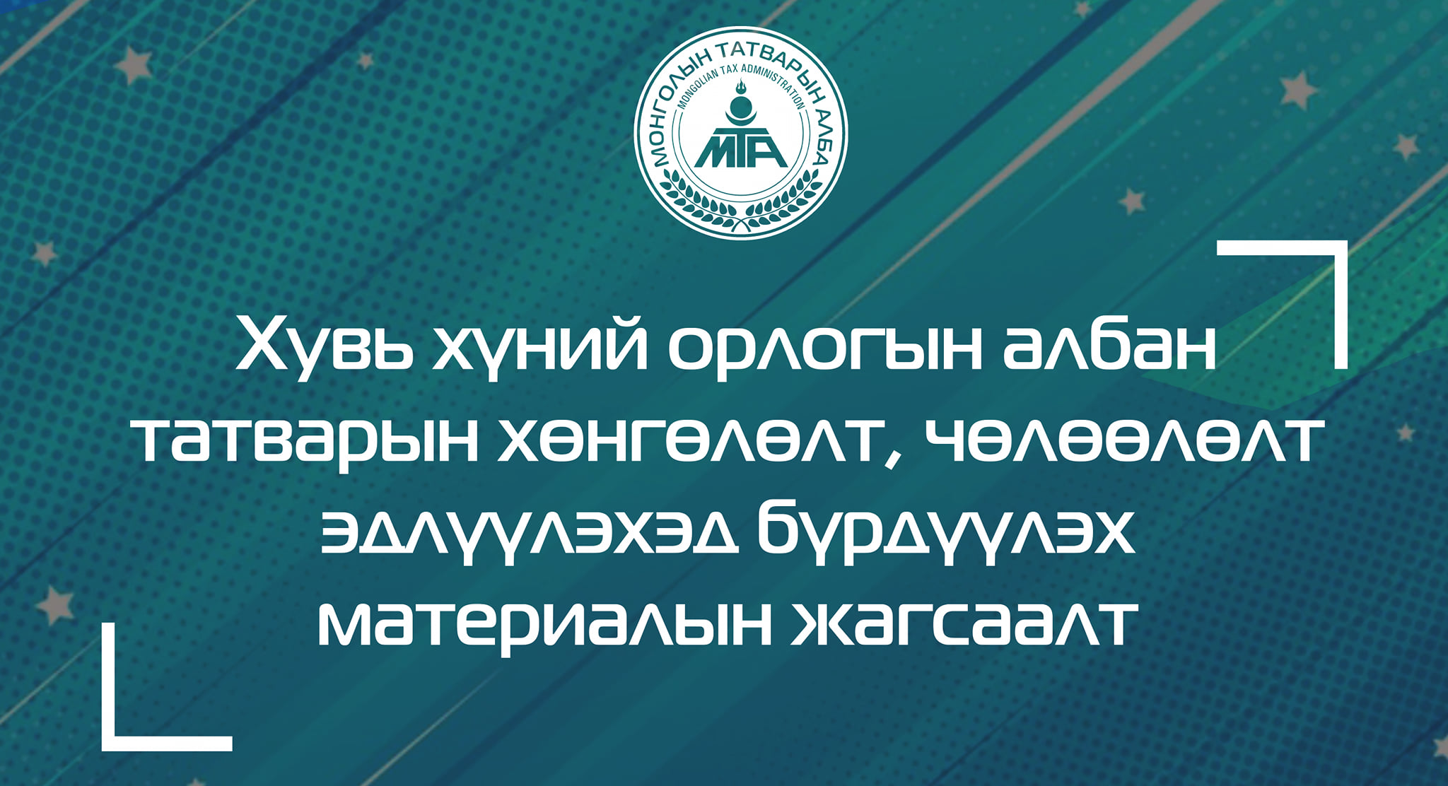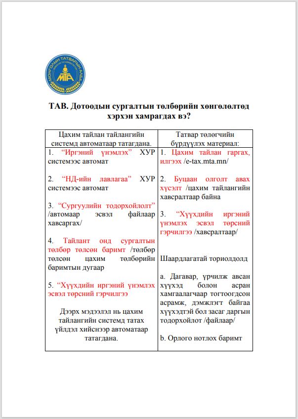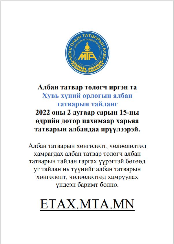 Албан татвар төлөгч иргэн та Хувь хүний орлогын албан татварын тайланг 2022 оны 2 дугаар сарын 15-ны өдрийн дотор цахимаар харьяа татварын албандаа ирүүлээрэй.