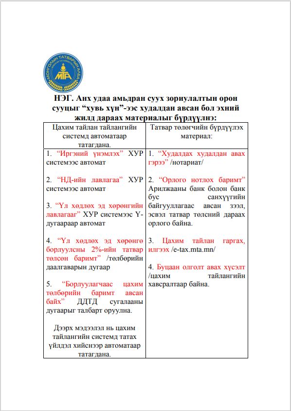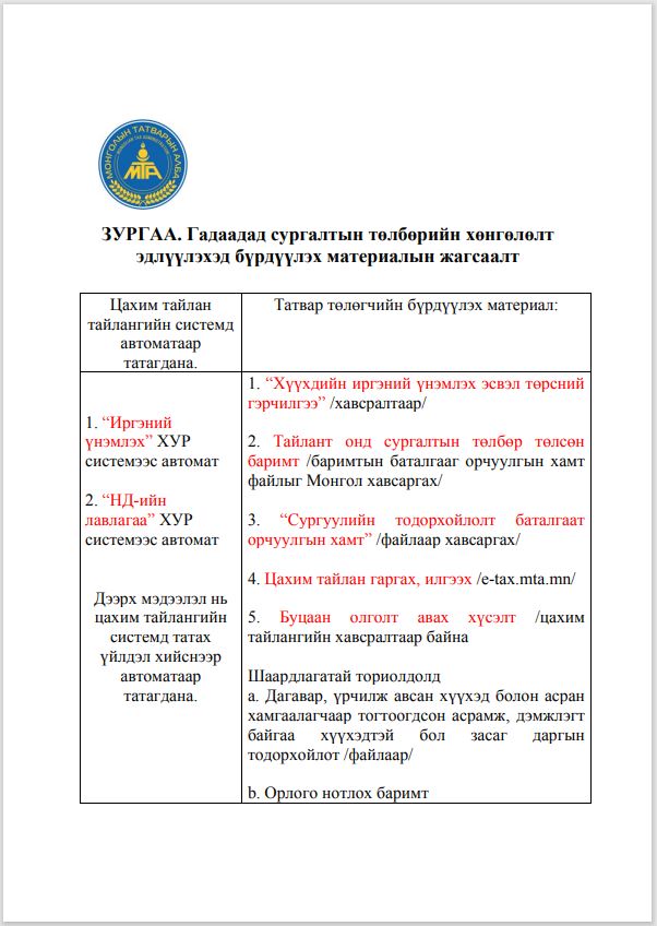 Хувь хүний орлогын албан татварын хөнгөлөлт, чөлөөлт эдлүүлэхэд бүрдүүлэх материалын жагсаалт