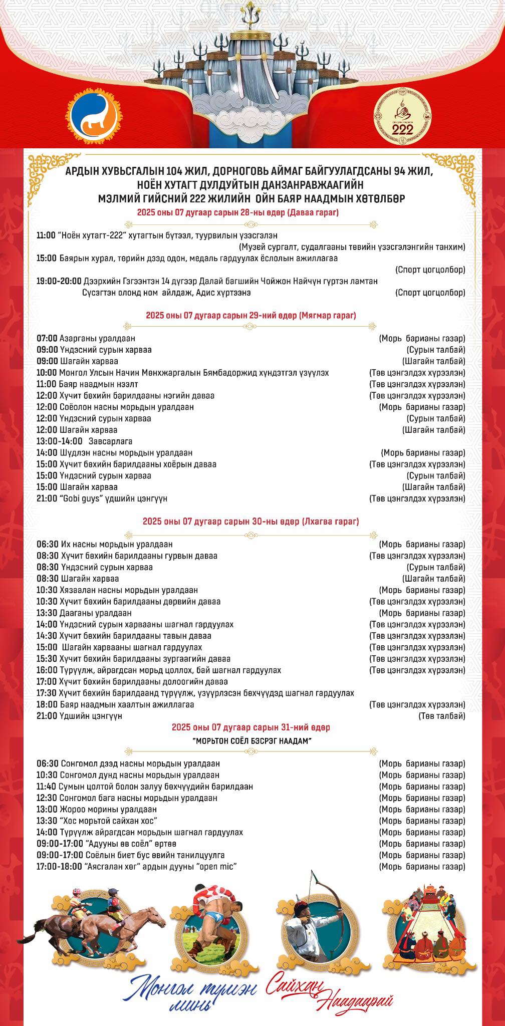 АРДЫН ХУВЬСГАЛЫН 104 ЖИЛ, ДОРНОГОВЬ АЙМАГ БАЙГУУЛАГДСАНЫ 94 ЖИЛ, НОЁН ХУТАГТ ДУЛДУЙТЫН ДАНЗАНРАВЖААГИЙН МЭЛМИЙ ГИЙСНИЙ 222 ЖИЛИЙН ОЙН БАЯР НААДМЫН ХӨТӨЛБӨР