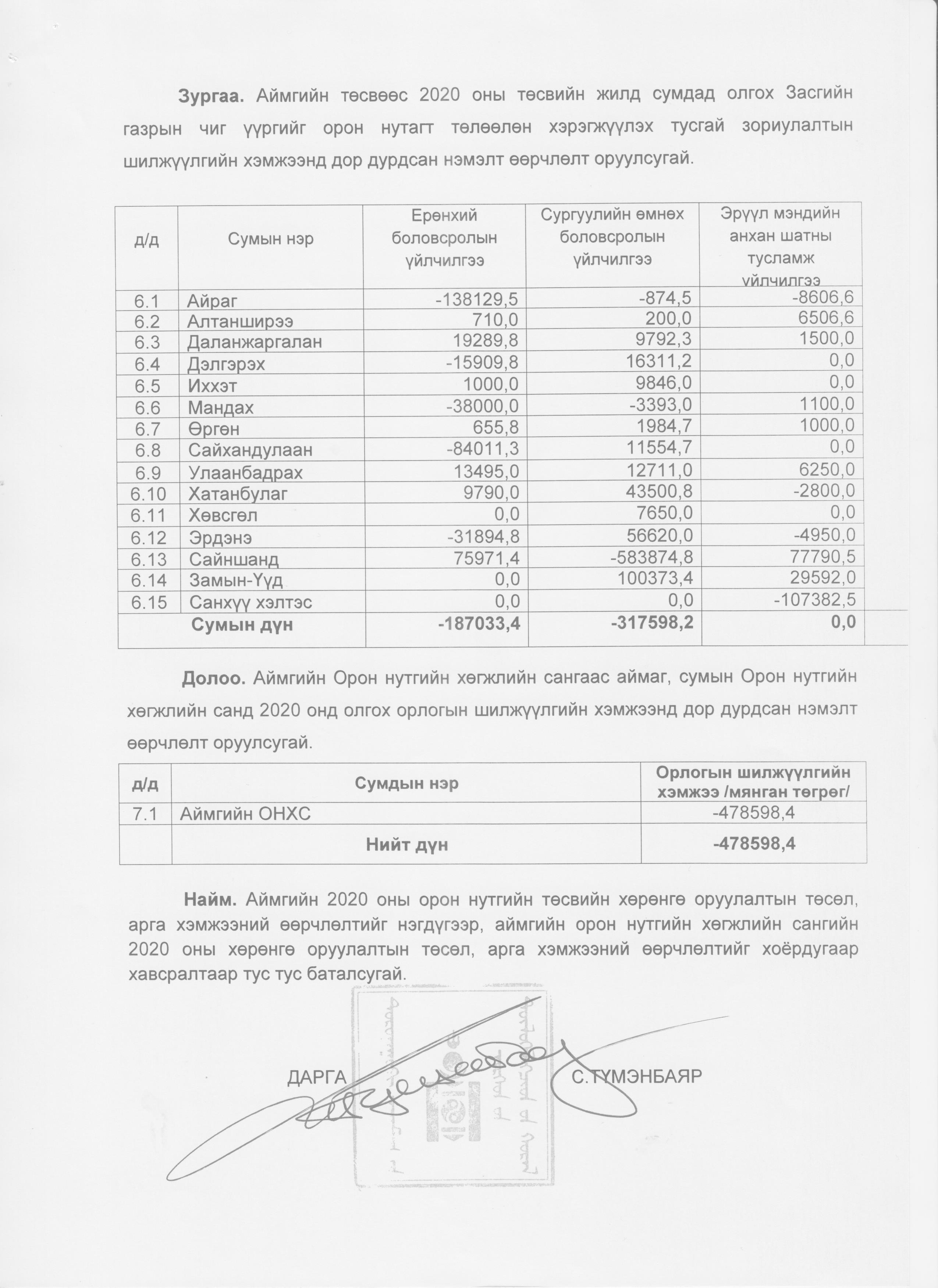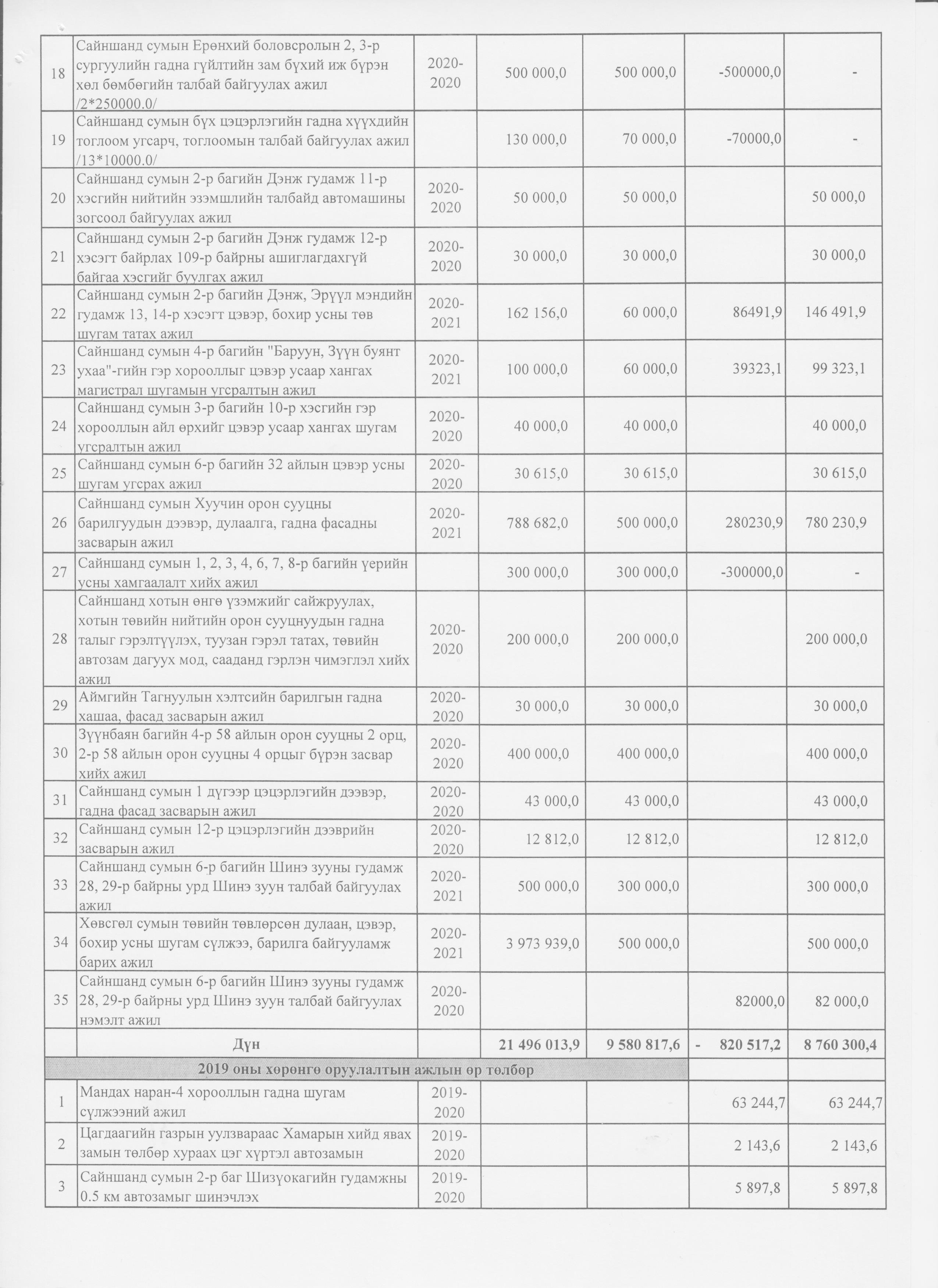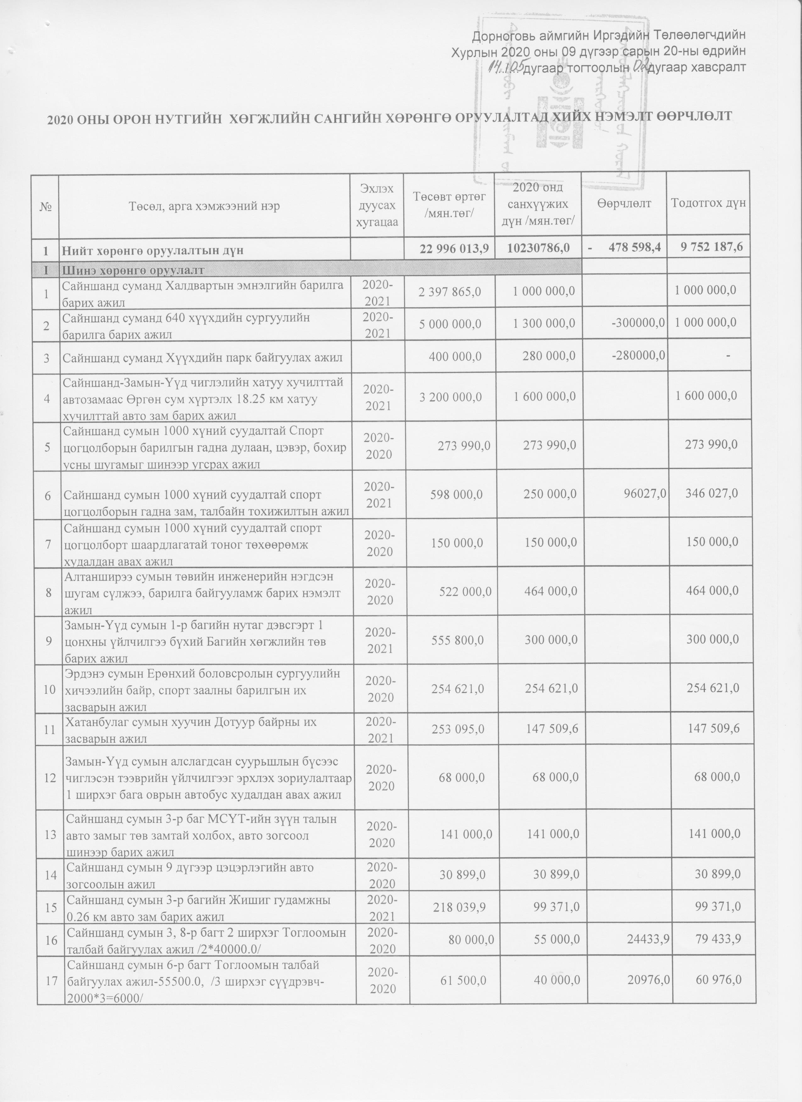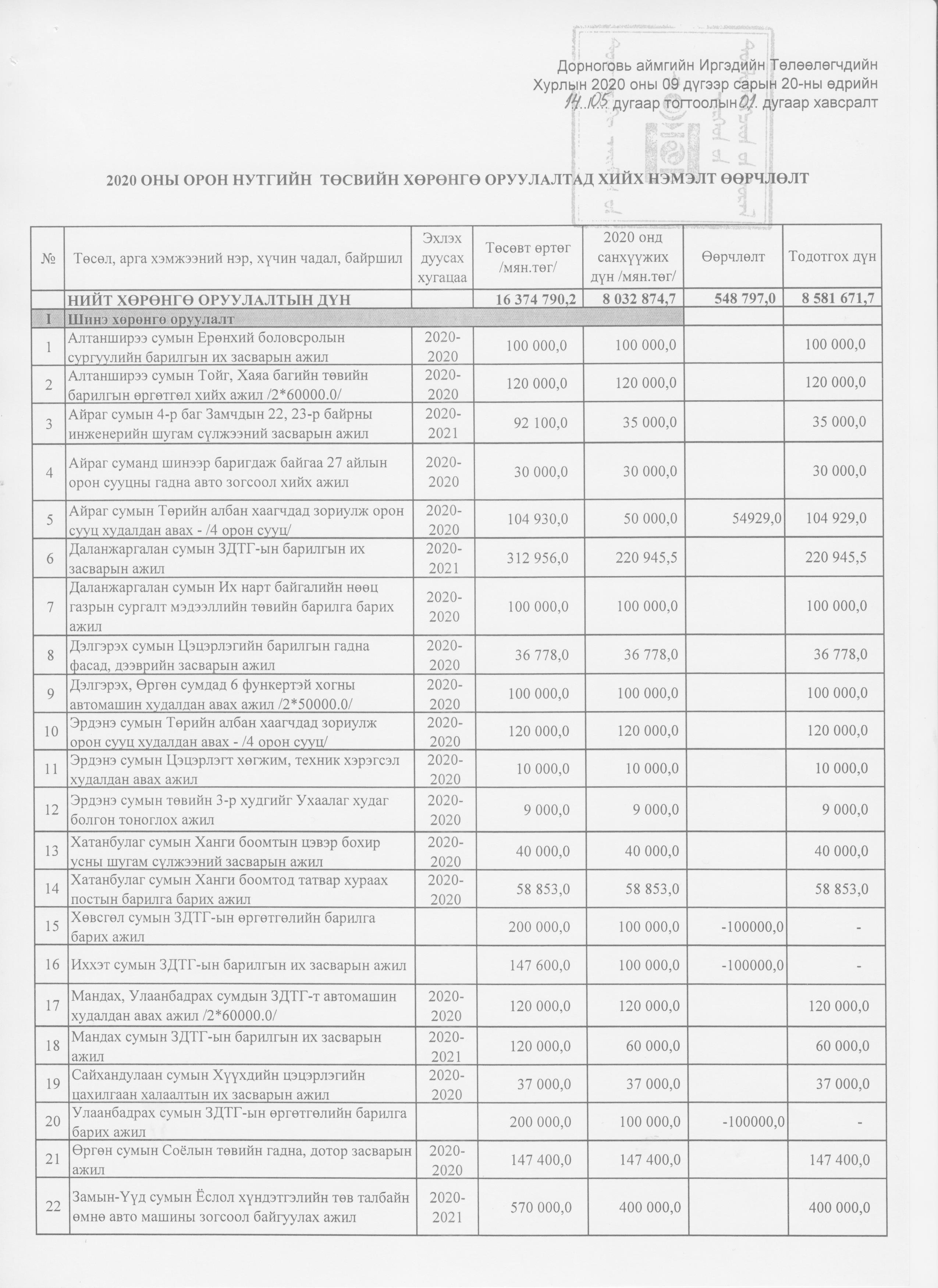 Аймгийн 2020 оны төсвийн нэмэлт өөрчлөлт 2020-10-29 Аймгийн Засаг даргын Тамгын газар Анхчимэг Аймгийн 2020 оны төсвийн нэмэлт өөрчлөлт Зураг ( 11 ) Файл ( 1 ) ‹ › # Файлын нэр Тайлбар 1 2020-тод-төсөв.xlsx