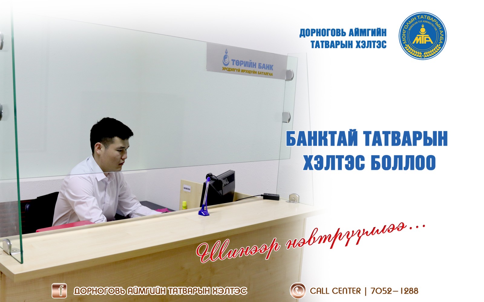 Дорноговь аймгийн Татварын хэлтсийн байранд Төрийн банкны нэг цонхны үйлчилгээ нэвтэрч, татвар төлөгч та бүхэнд банкны үйлчилгээг түргэн шуурхай үзүүлж эхэллээ.