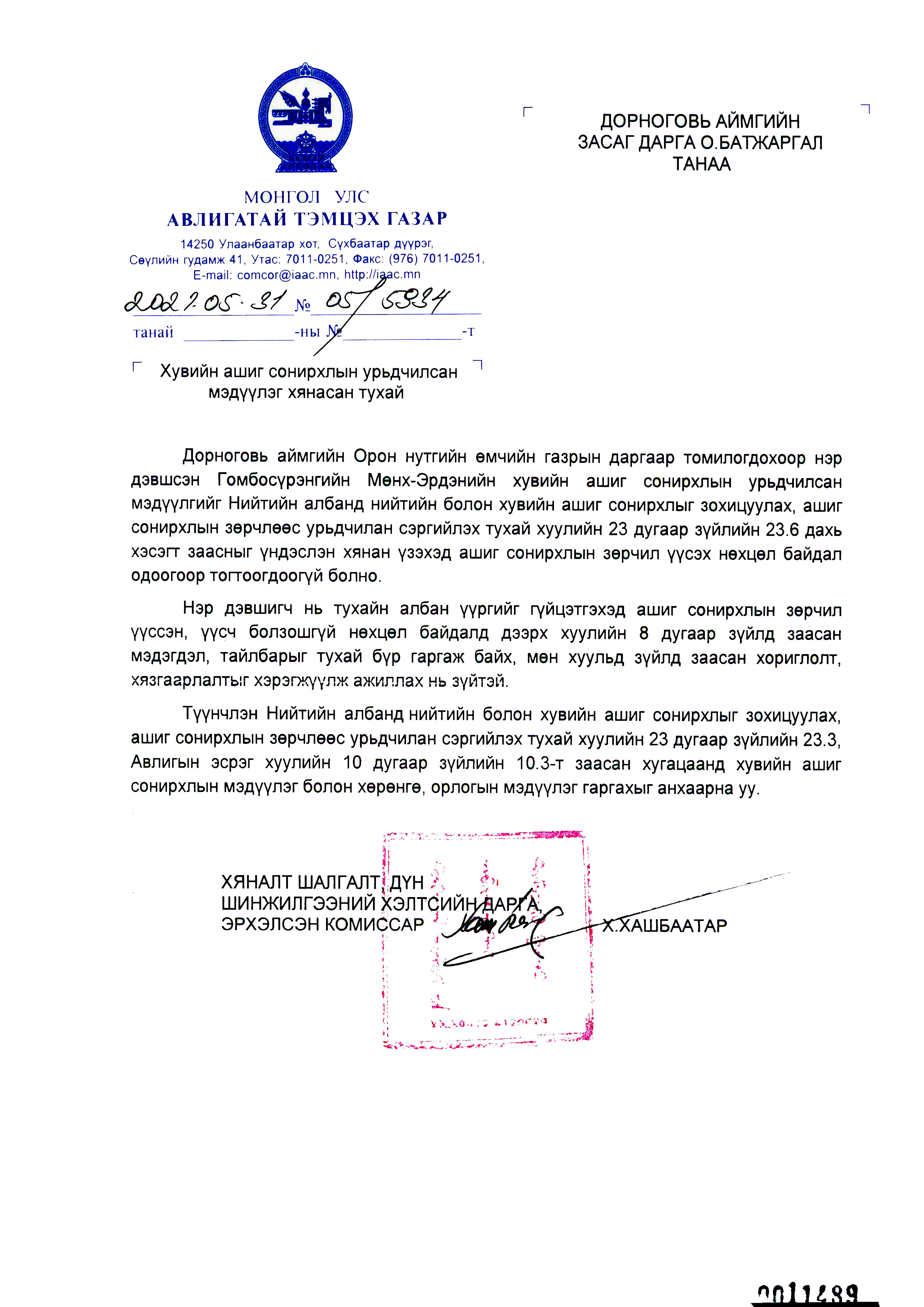 Дүгнэлт 2021-05-31 Аймгийн Засаг даргын Тамгын газар Ц Хувийн ашиг сонирхлын урьдчилсан мэдүүлэг хянасан тухай дүгнэлт Файл ( 1 ) # Файлын нэр Тайлбар 1 2021-05-31 5934.jpg