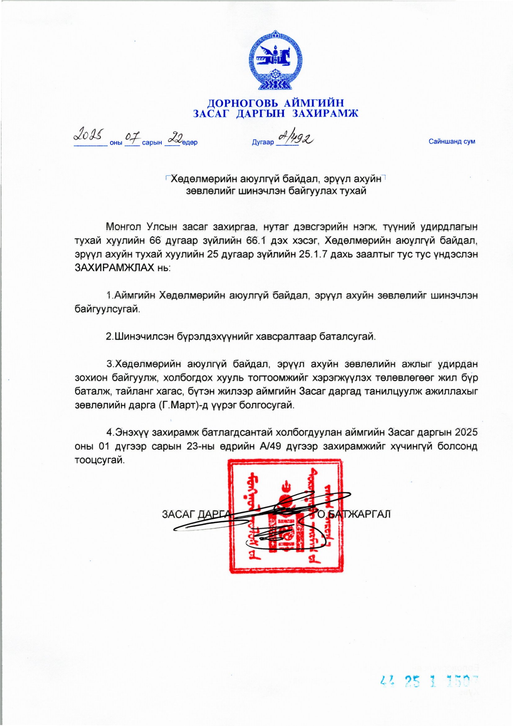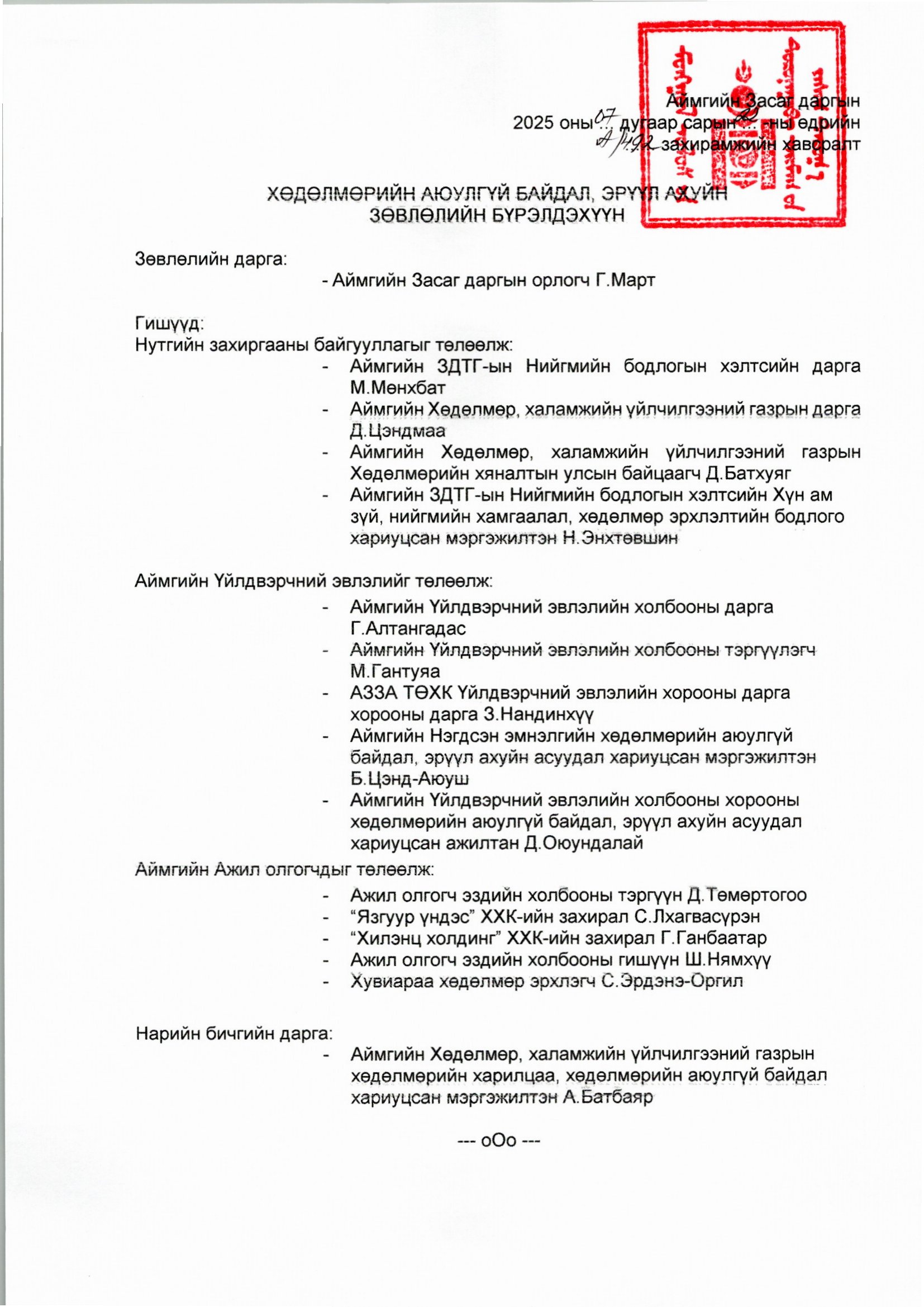 Хөдөлмөрийн аюулгүй байдал, эрүүл ахуйн зөвлөлийг шинэчлэн байгуулах тухай Актын дугаар: А/492 Батлагдсан огноо: 2025-07-22 Хөдөлмөрийн аюулгүй байдал, эрүүл ахуйн зөвлөлийг шинэчлэн байгуулах тухай Зураг ( 1 ) ‹ ›