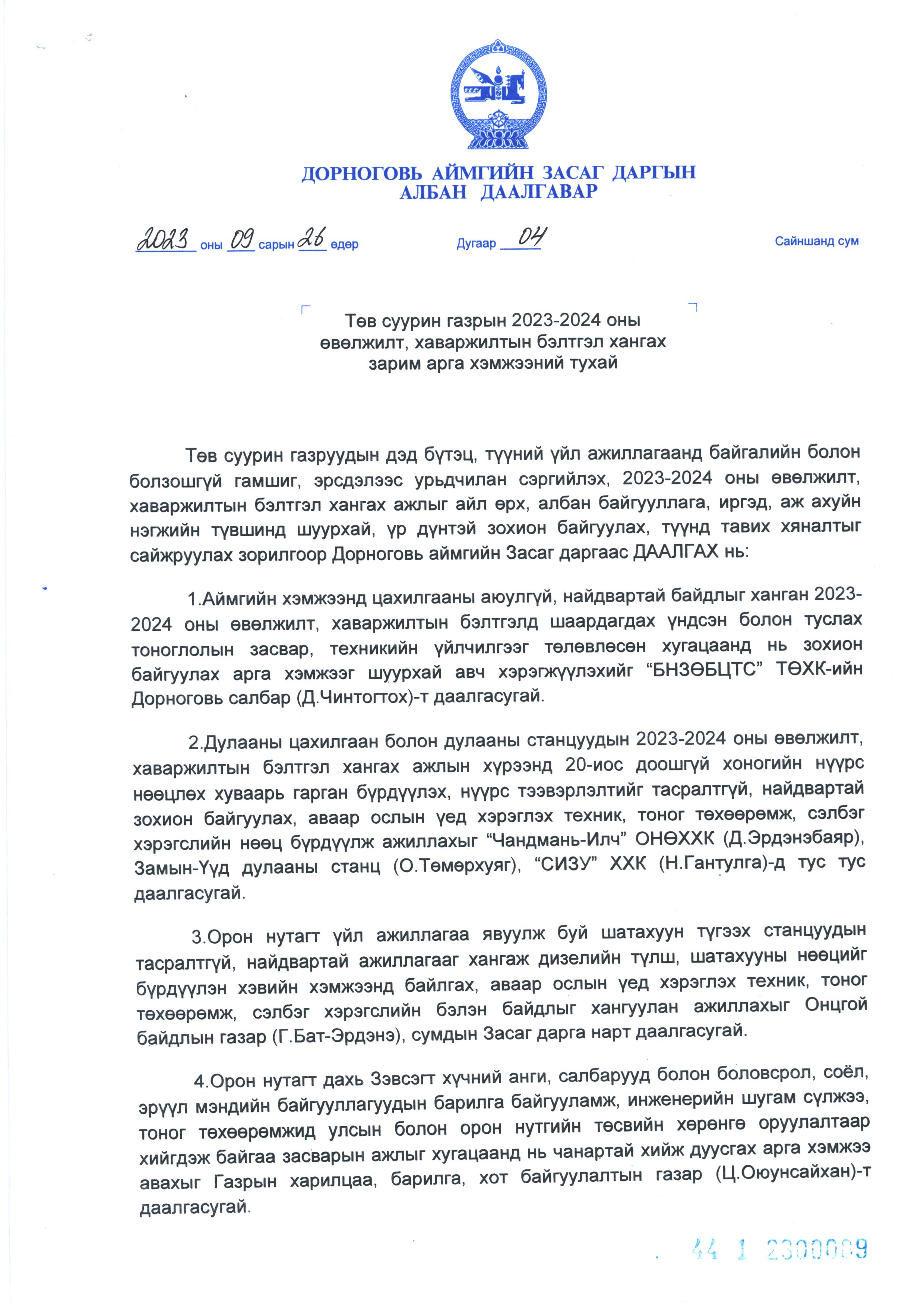 Төв суурин газрын 2023-2024 оны өвөлжилт, хаваржилтын бэлтгэл хангах зарим арга хэмжээний тухай Актын дугаар: 04 Батлагдсан огноо: 2023-09-26 Төв суурин газрын 2023-2024 оны өвөлжилт, хаваржилтын бэлтгэл хангах зарим арга хэмжээний тухай Зураг ( 2 ) ‹ ›