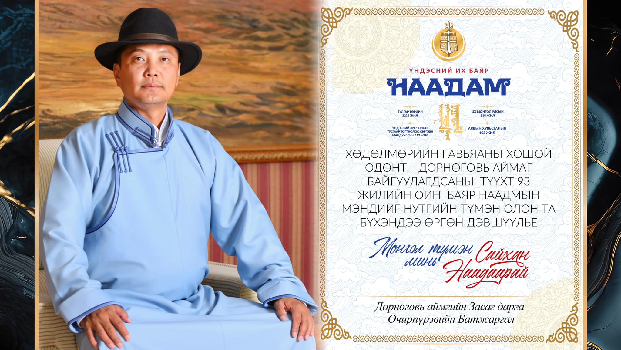 Хүн бүрийн хүсэл мөрөөдөл биелэн, хүүхэд бүр аз жаргалтай байж, айл бүхний голомтын гал ашид мөнх бадран дүрэлзэж, азай буурал ахмадууд минь сэтгэл тэнэгэр жарган, төрөлх сайхан нутаг минь дэвжин дээшлэхийн эрхэм ерөөлийг баяр наадмын мэндийн хамтаар айлтган дэвшүүлье.