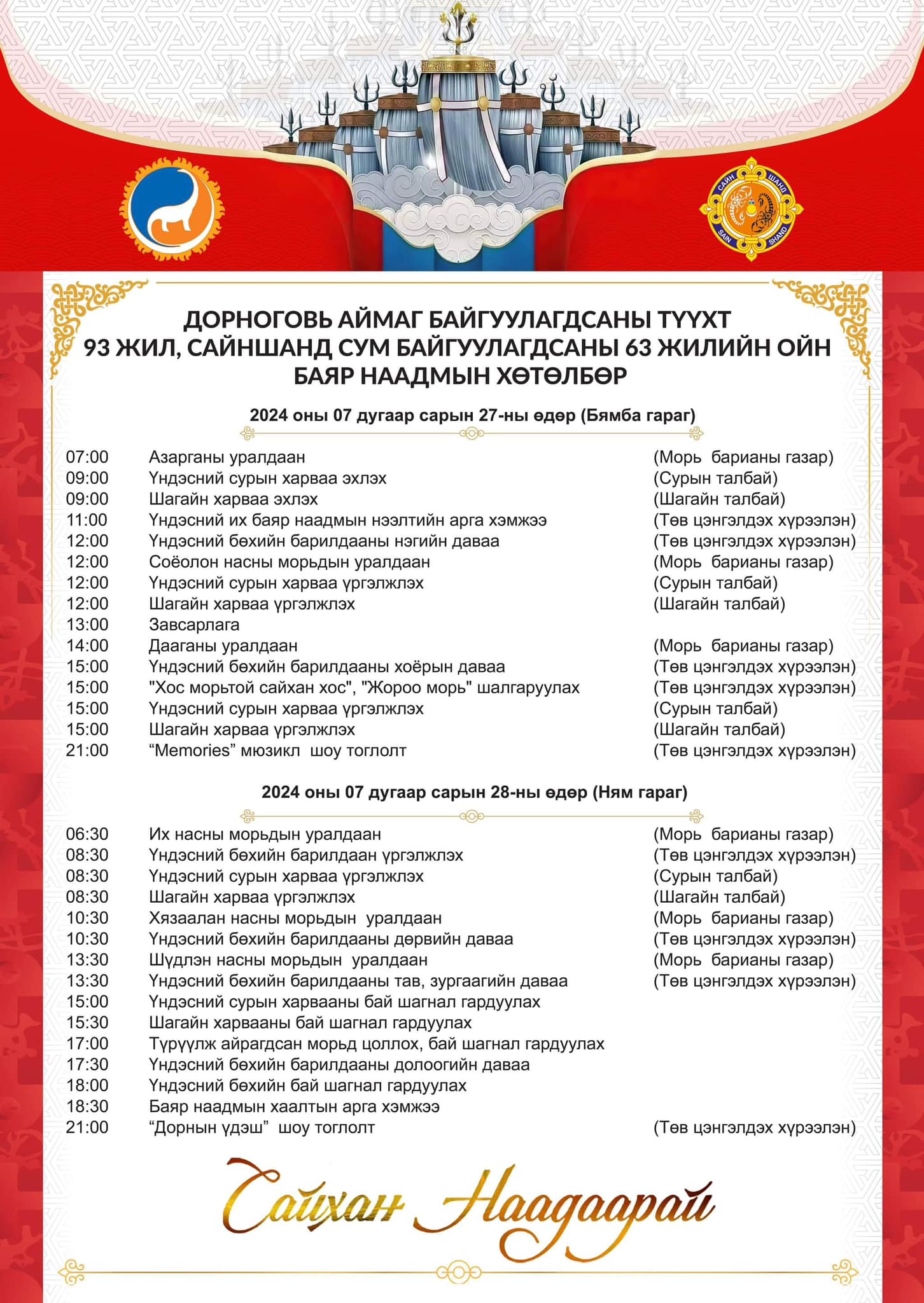 ДОРНОГОВЬ АЙМАГ БАЙГУУЛАГДСАНЫ ТҮҮХТ 93 ЖИЛИЙН ОЙН БАЯР НААДАМ 2024 ОНЫ 07 ДУГААР САРЫН 27, 28-НЫ ӨДРҮҮДЭД БОЛНО