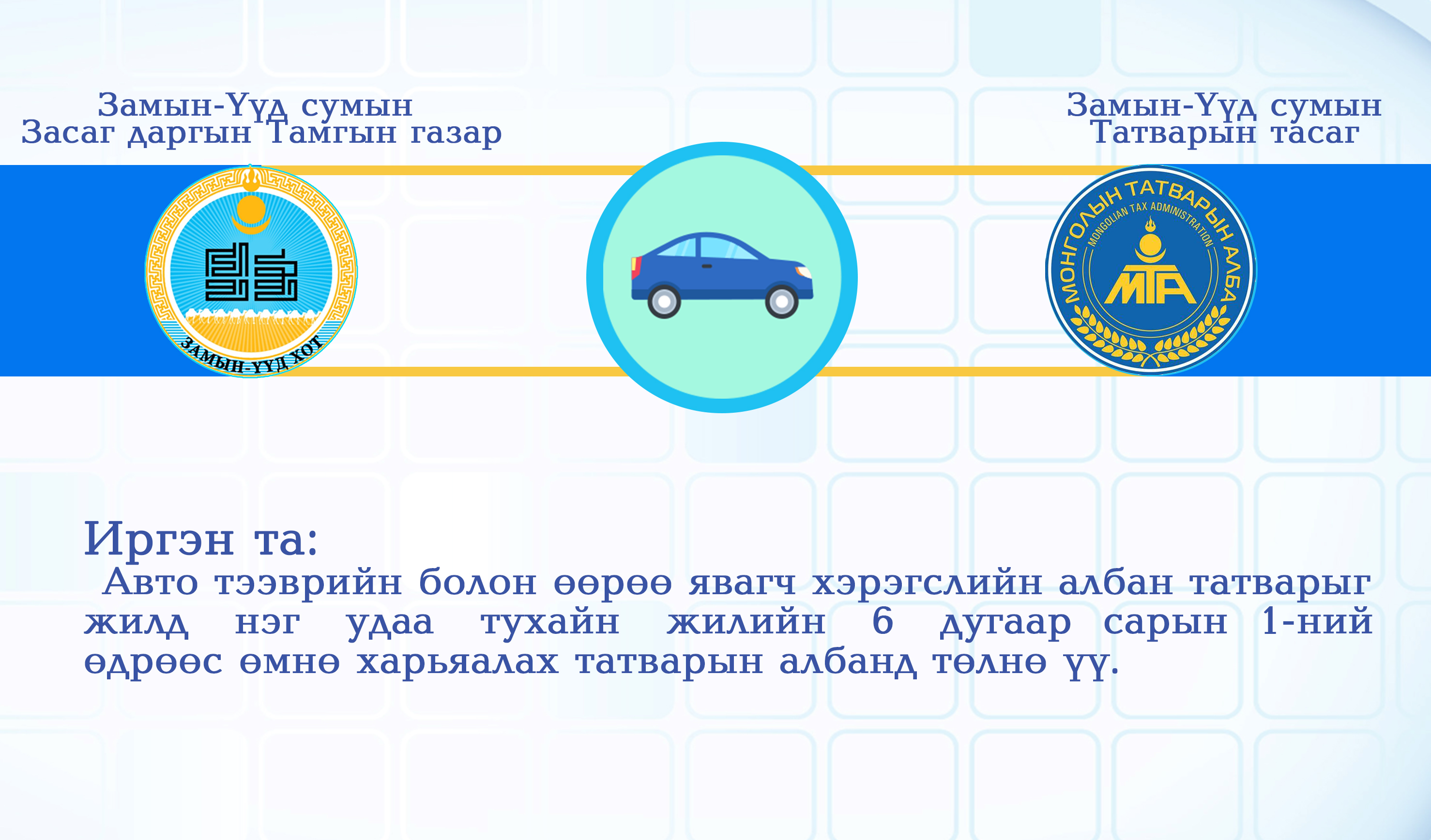 Замын-Үүд сумын Татварын Тасаг, Засаг Даргын Тамгын Газартай хамтран "Тээврийн хэрэгслийн татвараа хуулийн хугацаандаа төлцгөөе!" аяныг 2022.05.09-2022.05.31-ний өдрийг дуустал зохион байгуулж байна.