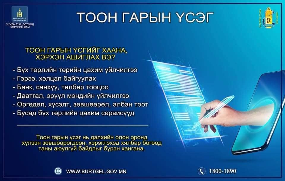 Монгол Улсын 16 ба түүнээс дээш насны иргэдэд тоон гарын үсгийг олгож эхэлнэ. Тоон гарын үсгийг 5 жилийн хугацаатайгаар үнэ төлбөргүй олгох бөгөөд иргэний үнэмлэхийн санах ойд байршуулах юм.
