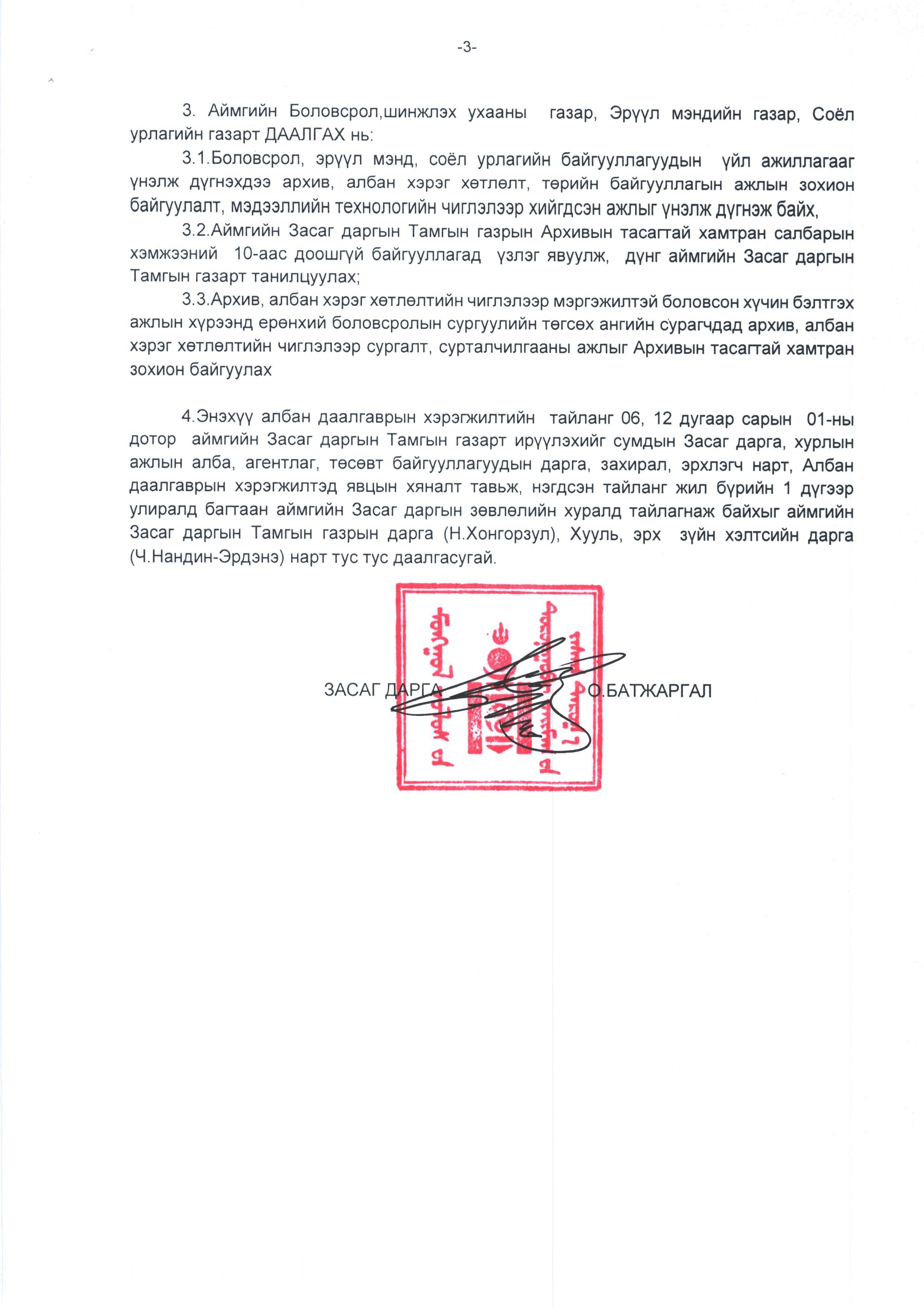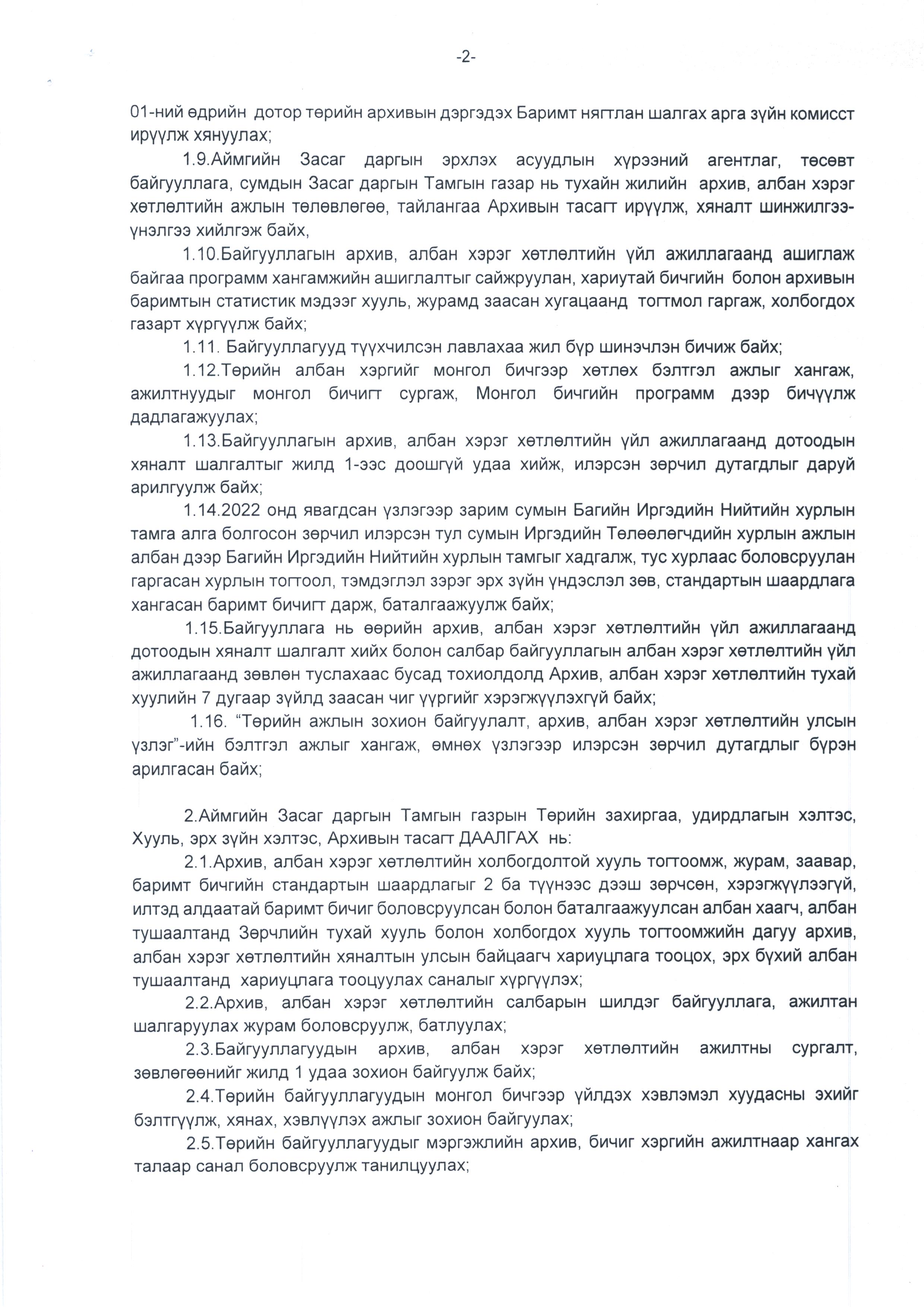Архив, албан хэрэг хөтлөлтийн тухай хуулийн хэрэгжилтийг эрчимжүүлэх талаар авах арга хэмжээний тухай Актын дугаар: 01 Батлагдсан огноо: 2023-03-24 Архив, албан хэрэг хөтлөлтийн тухай хуулийн хэрэгжилтийг эрчимжүүлэх талаар авах арга хэмжээний тухай Зураг ( 2 ) ‹ ›