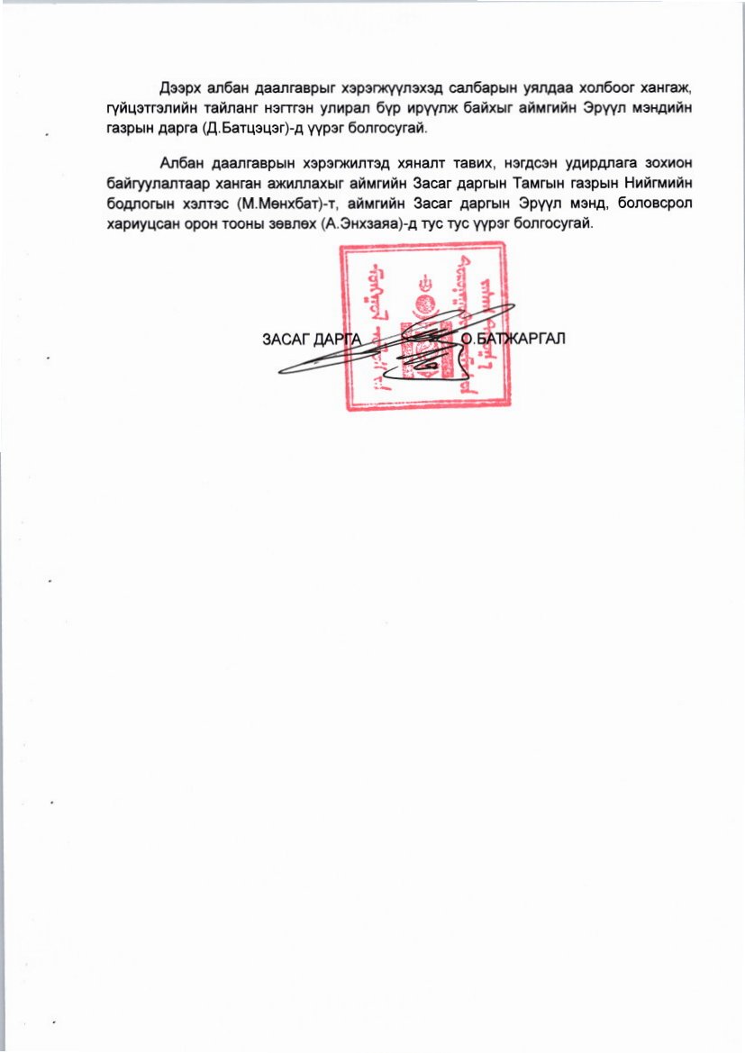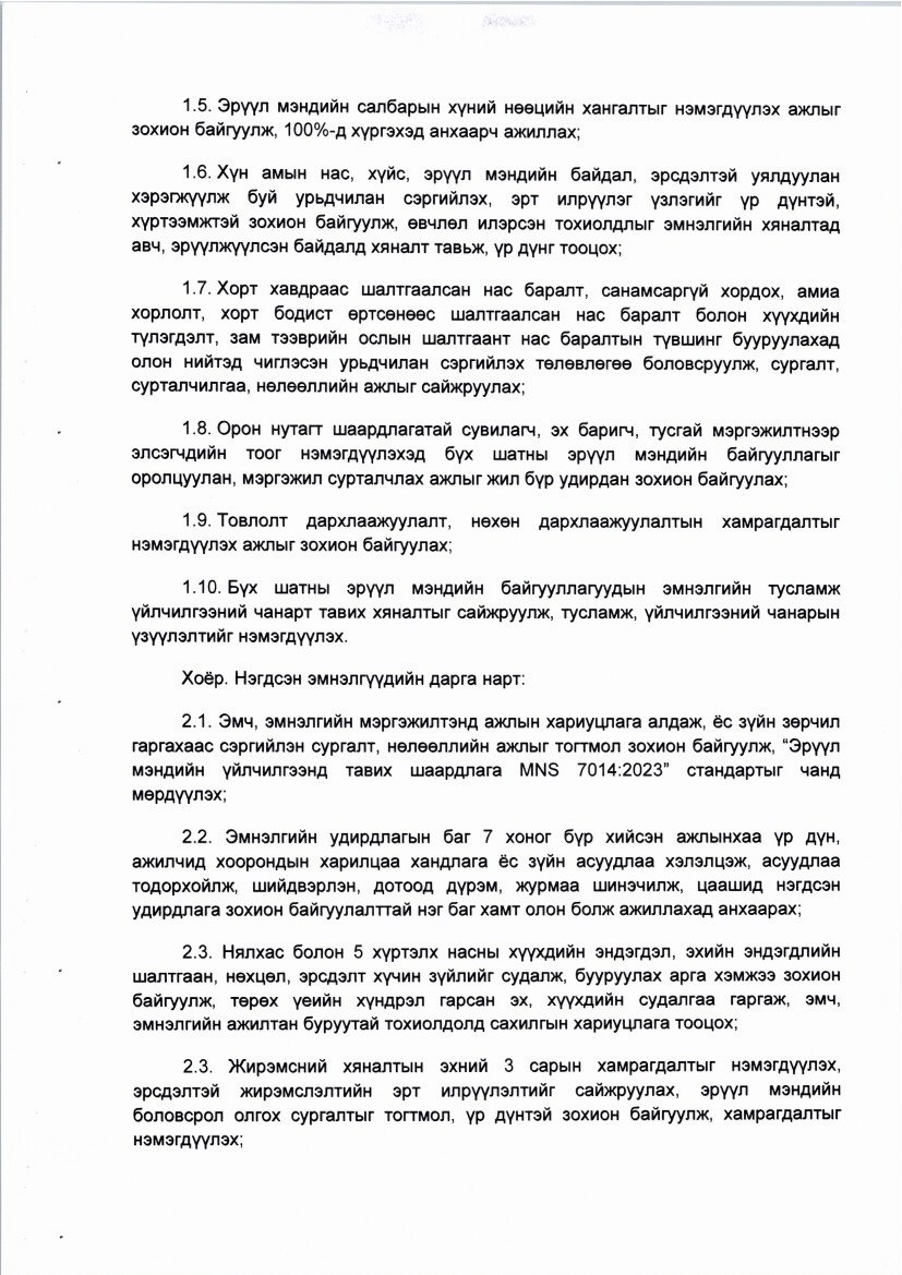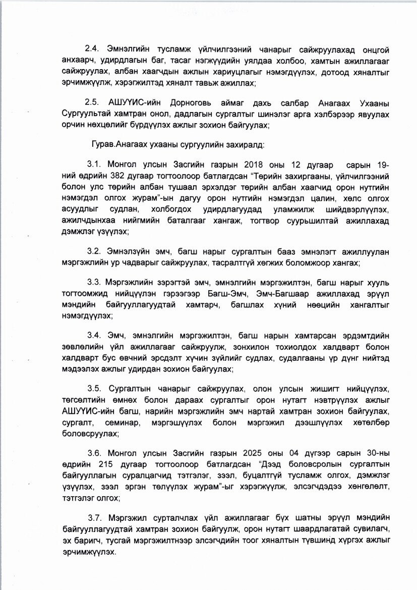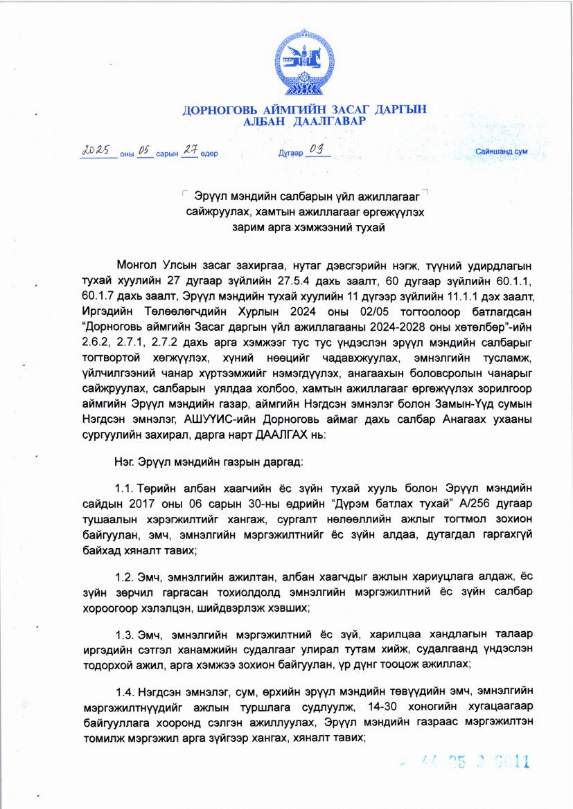 Эрүүл мэндийн салбарын үйл ажиллагааг сайжруулах, хамтын ажиллагааг өргөжүүлэх зарим арга хэмжээний тухай Актын дугаар: 03 Батлагдсан огноо: 2025-05-27 Эрүүл мэндийн салбарын үйл ажиллагааг сайжруулах, хамтын ажиллагааг өргөжүүлэх зарим арга хэмжээний тухай Зураг ( 3 ) ‹ ›