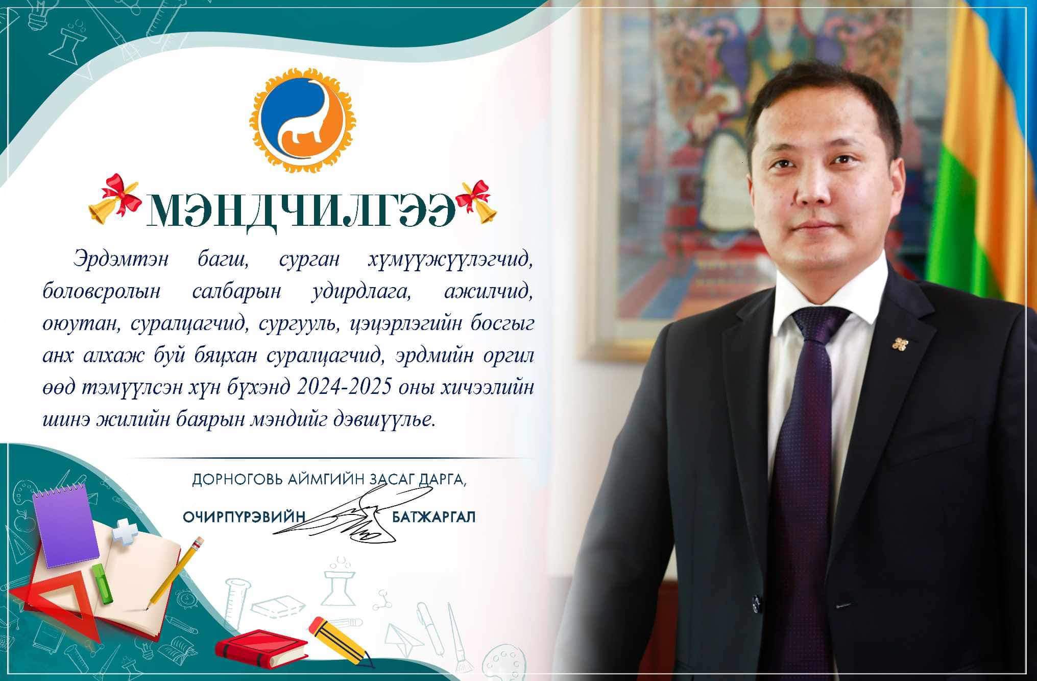 ХИЧЭЭЛИЙН ШИНЭ ЖИЛИЙН БАЯРЫН МЭНДИЙГ ДЭВШҮҮЛЬЕ 2024-09-01 Аймгийн Засаг даргын Тамгын газар Төрийн захиргааны удирдлагын хэлтэс ХИЧЭЭЛИЙН ШИНЭ ЖИЛИЙН БАЯРЫН МЭНДИЙГ ДЭВШҮҮЛЬЕ